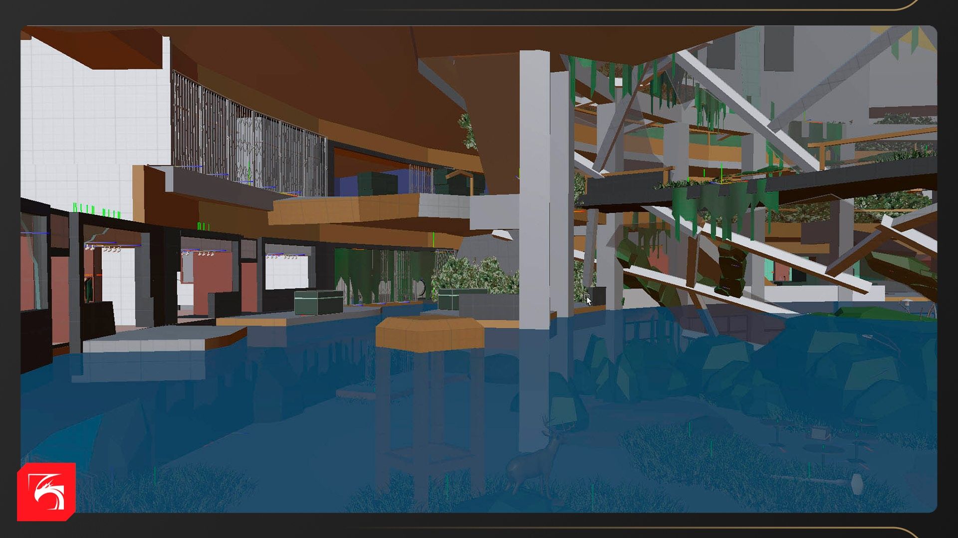 После проверки механик и расстановки основных элементов базовые формы усложняются. Некоторые объекты заменяются на полноценные 3D-модели. Это помогает левел-дизайнеру и художникам по окружению оценить, как будет всё выглядеть визуально. На этом этапе важно, чтобы улучшения в визуальной составляющей не усложнили прохождение и восприятие уровня.