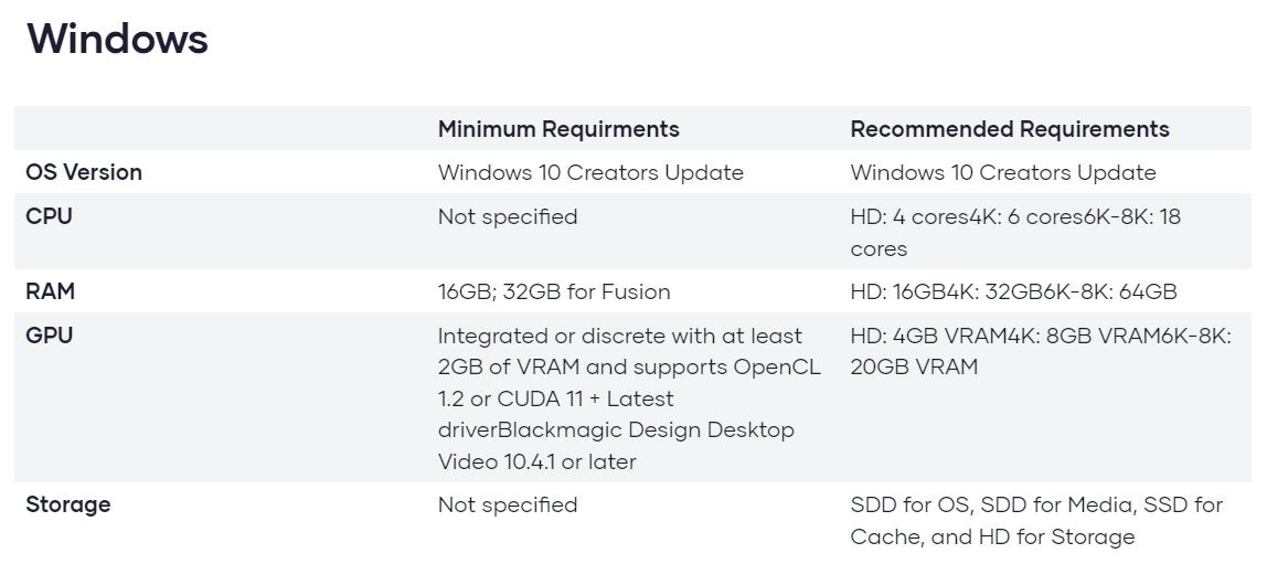 Если кратко пробежаться по системным требования от Blackmagicdesign, пусть и устаревшим, потребуется: какой-нибудь процессор, любая видеокарта с 2 ГБ набортной памяти (даже реализована поддержка Intel Arc), 16 ГБ оперативной памяти и 32 ГБ при использовании Fusion, а также обязательно Windows 10 с обновлением Creators Update. Более новые версии OC поддерживаются, но не более старые.