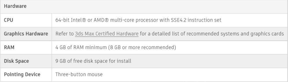 Как и большинство разработчиков программного обеспечения, Autodesk опубликовала официальные системные требования, при чём для каждой версии отдельно. Для 3ds Max с ними можно ознакомиться здесь, а для Maya здесь. Требования богатырскими не назвать. В случае версий 2022 года это любой многоядерный процессор с поддержкой инструкций SSE4.2, менее 10 ГБ свободного пространства на накопителе, от 4 ГБ оперативной памяти (от 8 ГБ для Maya). В отношении видеокарты всё сложно. Грубо говоря, что-то сопоставимое с GeForce GTX 1650 с 4 ГБ видеопамяти.