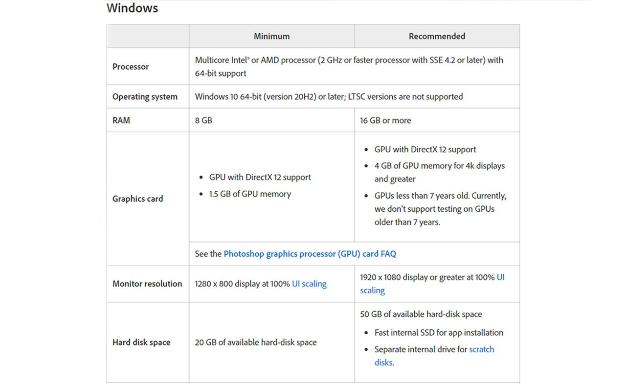 Официальные системные требования Photoshop