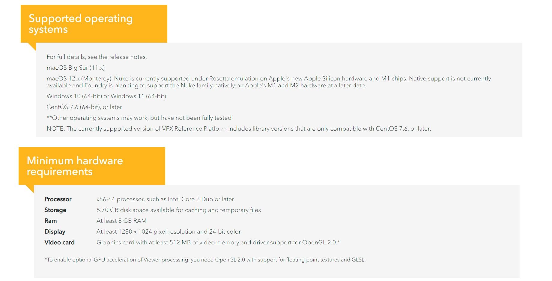 Как обычно начнём с системных требований, приведённых на официальном сайте Nuke (с ними можно ознакомиться здесь). Они очень щадящие, но нужно понимать, что разработчики из Foundry указывают только минимальные требования, да ещё и с неувязочками. К примеру, как минимум потребуется Windows 10 и процессор Intel Core 2 Duo, а Core 2 Duo впринципе не работает с Windows 10.