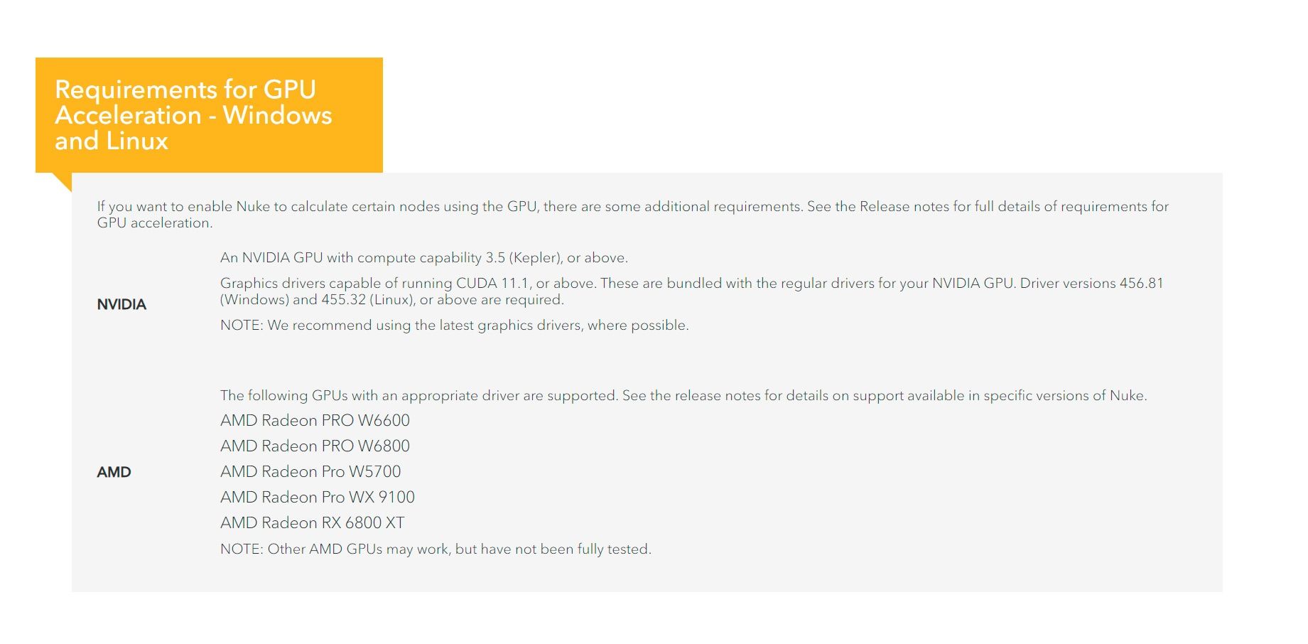 В любом случае потребуется видеокарта класса повыше среднего. Для Nuke стоит пристальнее присмотреться к AMD Radeon. Их сами разработчики больше рекомендуют, а также Radeon в том же бюджете могут похвастаться большим количеством видеопамяти, чем NVIDIA GeForce. А помимо оперативной памяти Nuke «любит» и видеопамять.