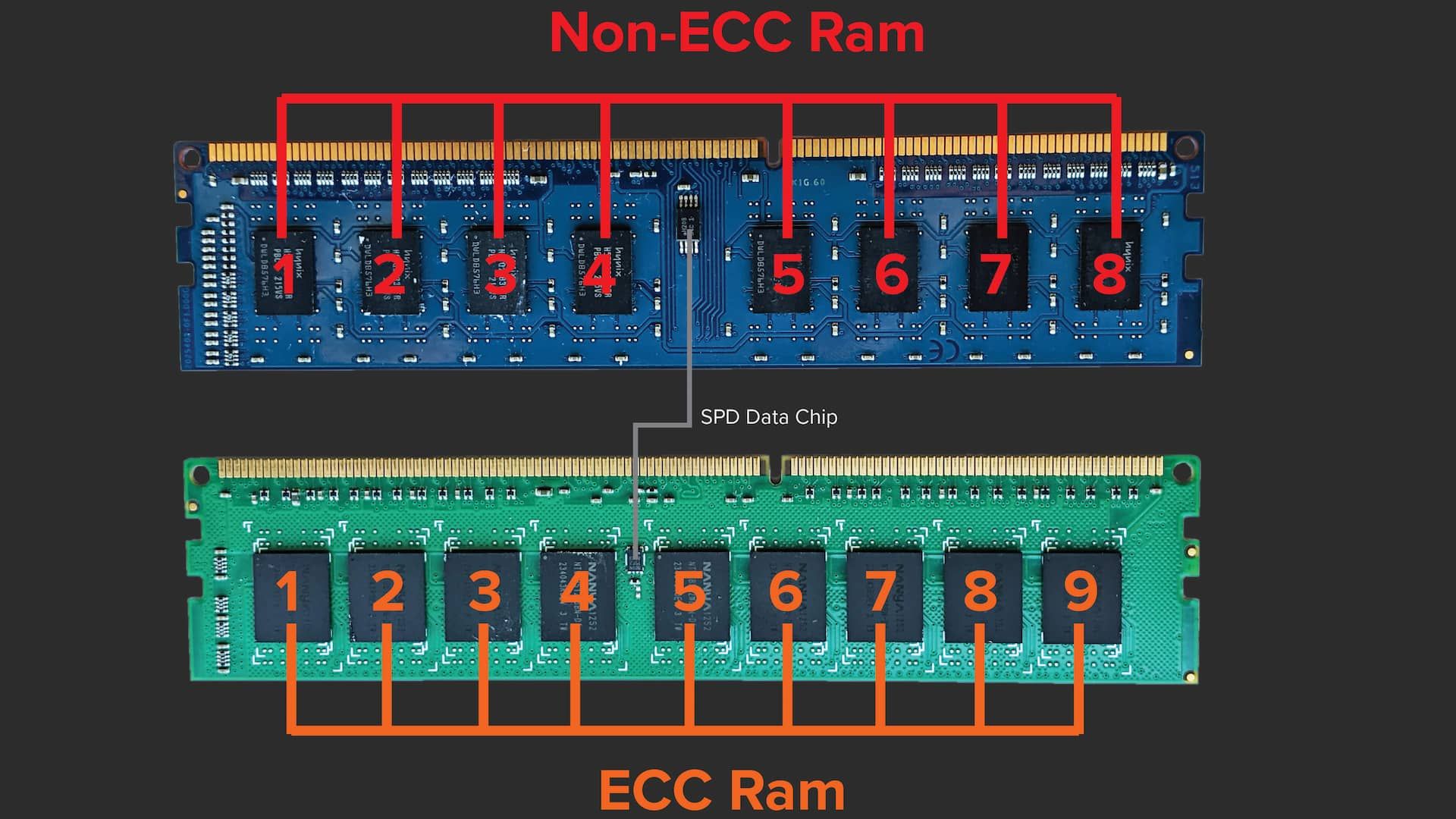 - Дополнительные чипы. Серверная версия несёт 25% больше микросхем DRAM для хранения битов чётности.
