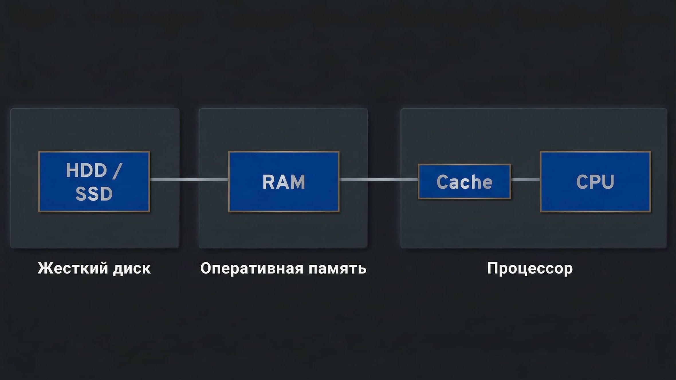 ОЗУ работает как быстрый буфер между центральным процессором и сравнительно более медленными NVMe. Современные серверные процессоры переваривают гигантские объёмы информации за доли секунды. Если бы процессор каждый раз запрашивал нужный файл с накопителя, он бы терял драгоценное время. Оперативная память решает эту проблему.