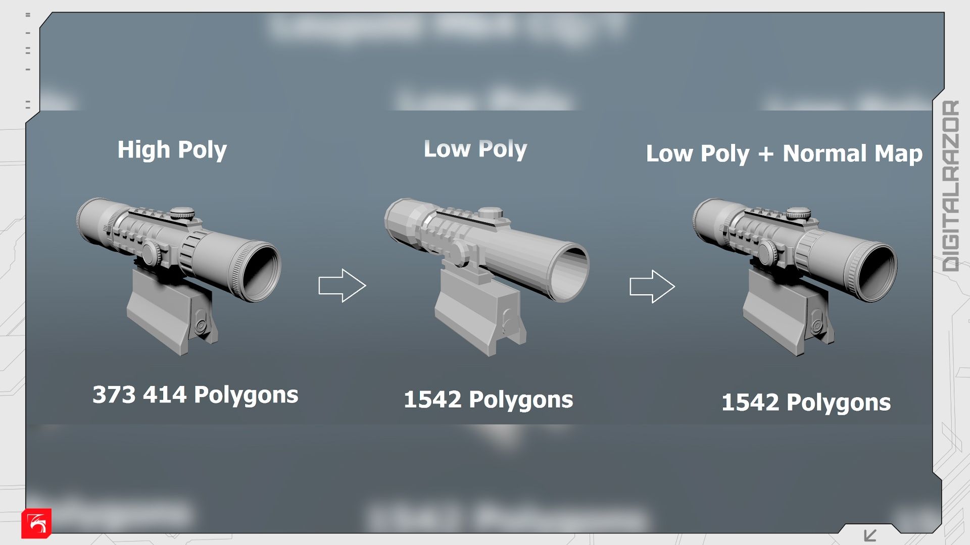 - Все детали с HP «запекаются» на LP-модель и помещаются в Normal-карту.