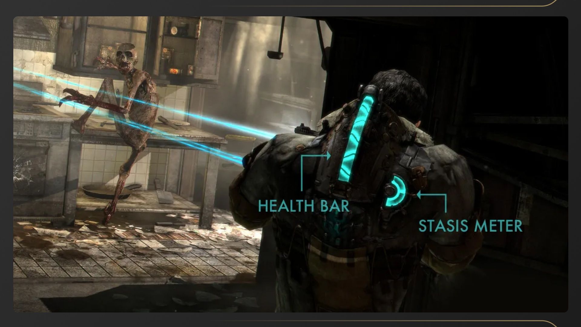 Dead Space (2008), на спине протагониста отображается его здоровье и количество стазиса