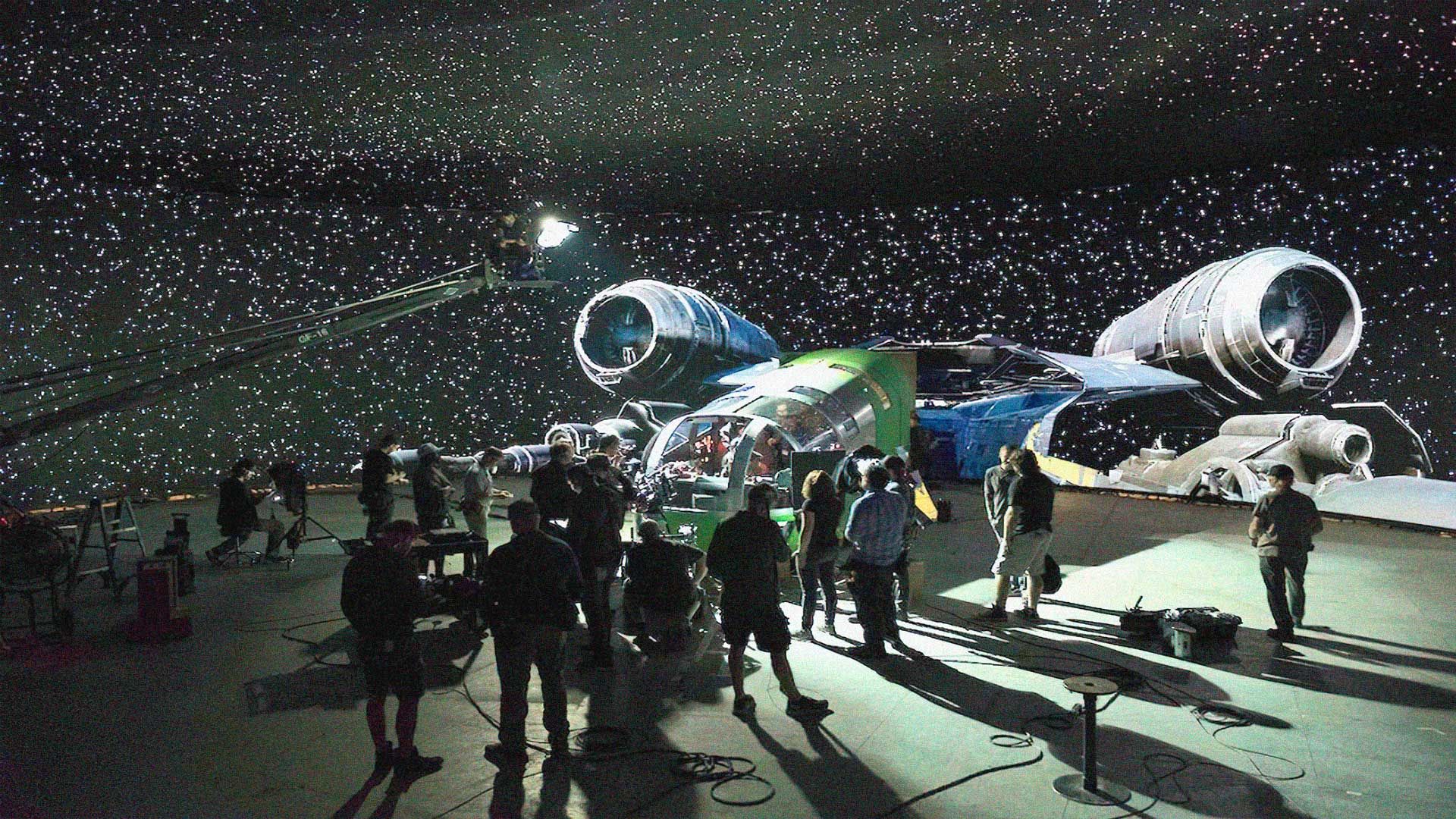Тут пригодился опыт команды «Изгоя-один». Модифицированный движок Unity сменили на Unreal Engine 4, а «виртуальное кресло» на «виртуальный продакшн». Команда использовала большой павильон с видеостенами из тысячи LED-панелей, а рендер окружения в реальном времени взял на себя новый движок. Технологию назвали The Volume.
