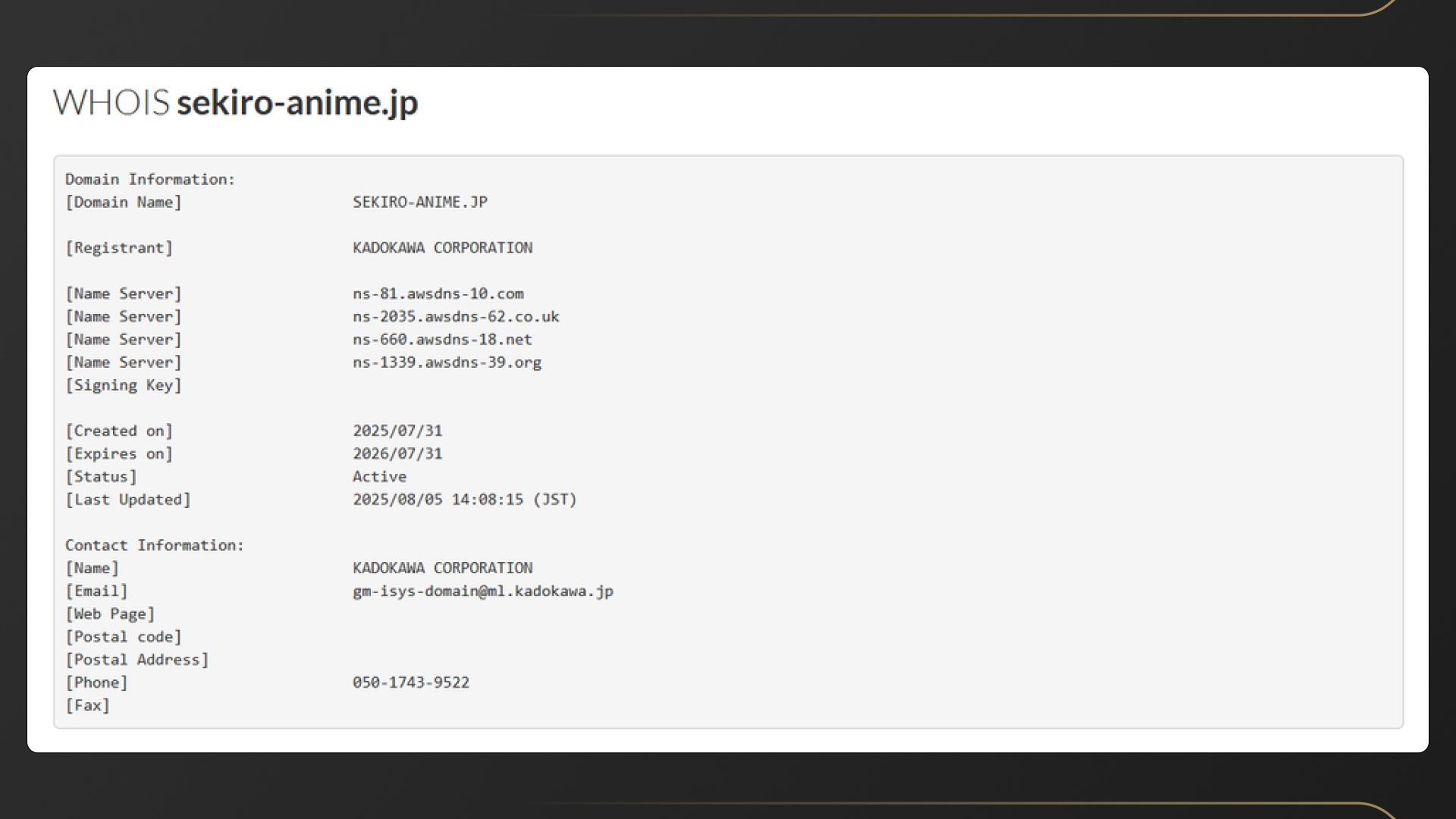 Kadokawa Corporation, которая является материнской компанией студии FromSoftware, зарегистрировала домен «sekiro-anime.jp». Он действителен до 31 июля 2026 года. Естественно, с возможностью продления.