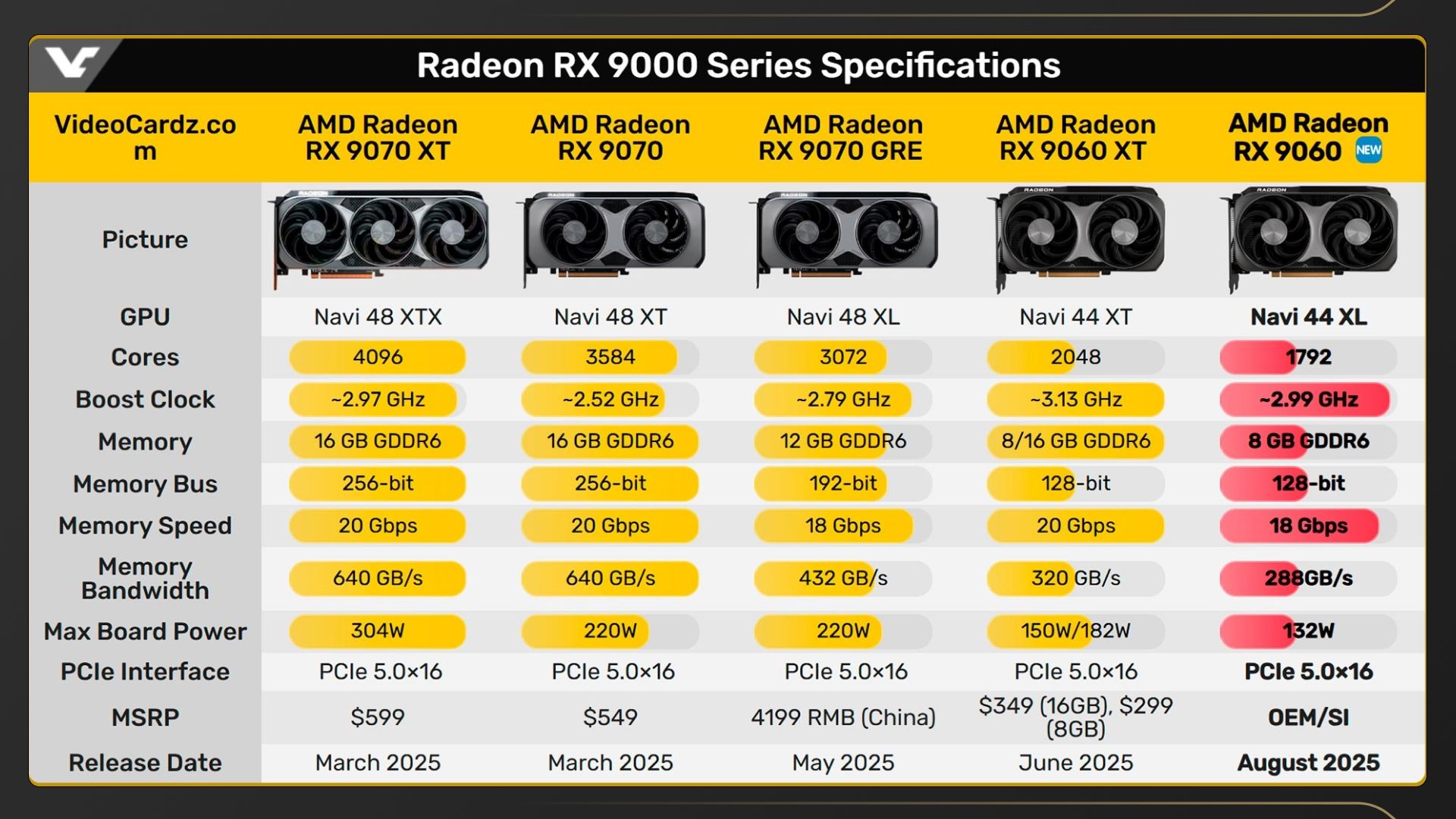 По-простому говоря, подсистема памяти почти не отличается от XT-версии (небольшая разница по частотам — 18 против 20 ГГц), а также на 12,5% урезан графический процессор. Расчётно новинка отстанет от 8-гигабайтной RX 9060 XT где-то на 17%.