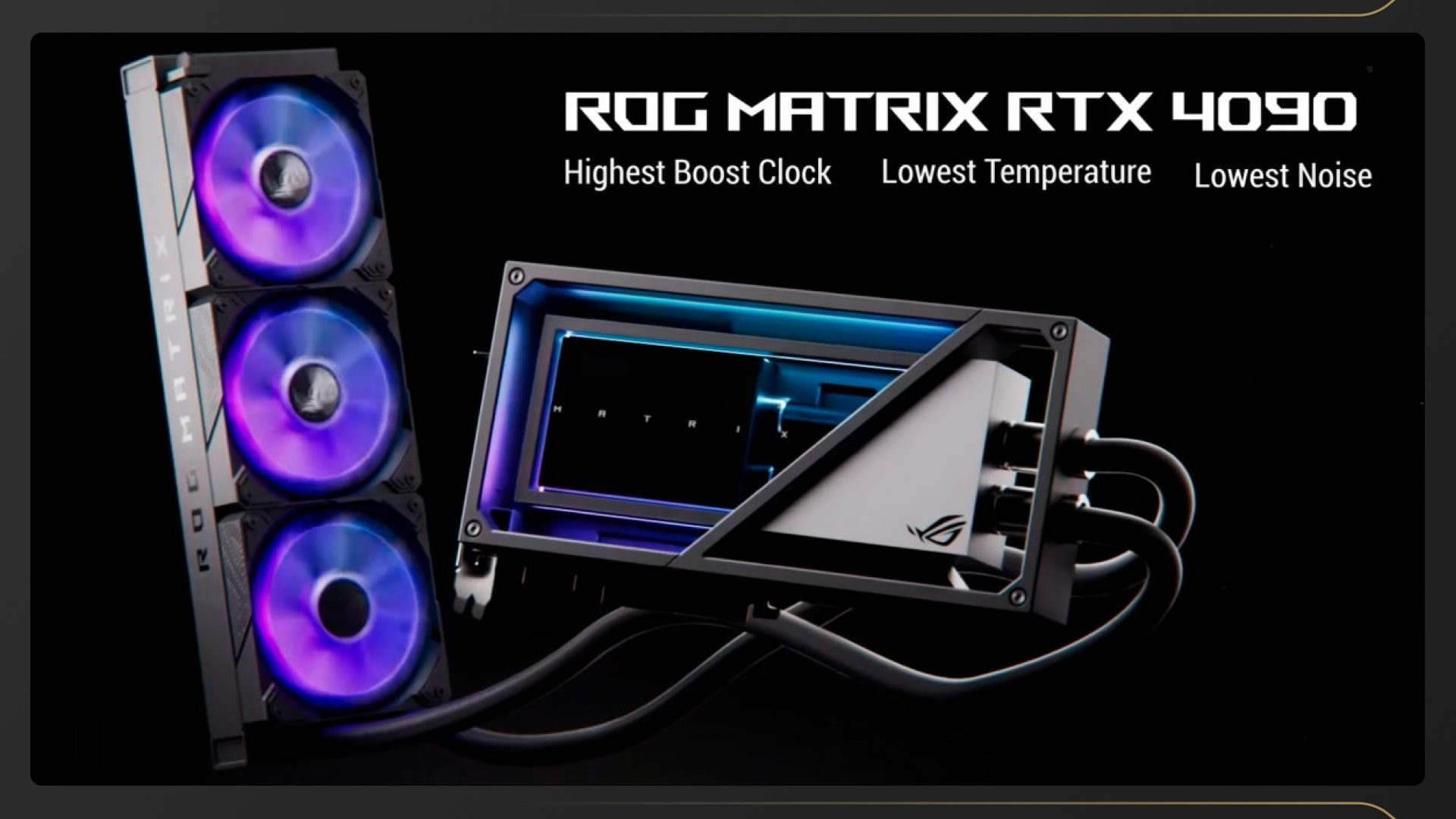 ROG Matrix GeForce RTX 4090 оснащается жидкостным кулером с 360-мм радиаторам. Она примечательна тем, что на момент выхода стоила как две RTX 4090 в модификациях попроще, а экземпляр с автографом Хуанга ушёл на аукционе за баснословные 16 000 долларов. Также это первая видеокарта, которую удалось разогнать до 4 ГГц по ядру.