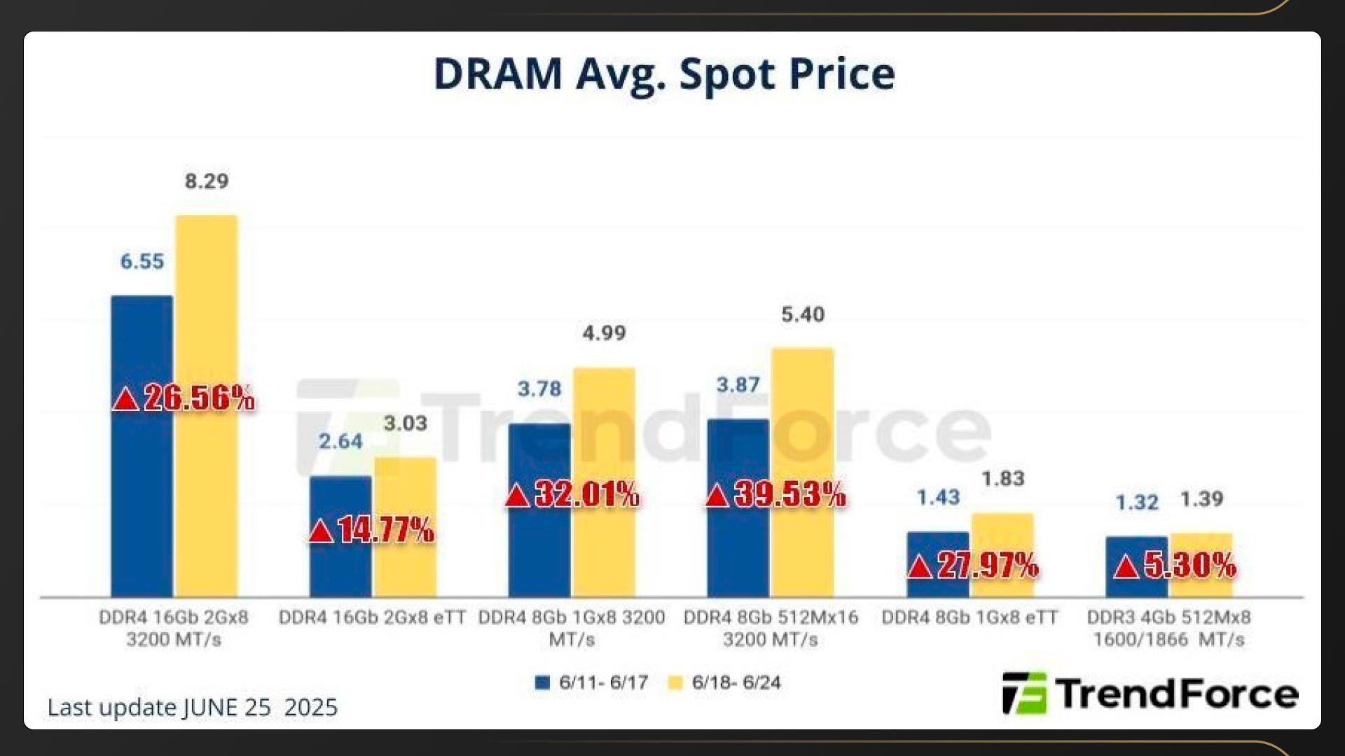 - Согласно данным аналитиков TrendForce, только за последнюю неделю чипы DDR4 подорожали на 14,8-39,5%;