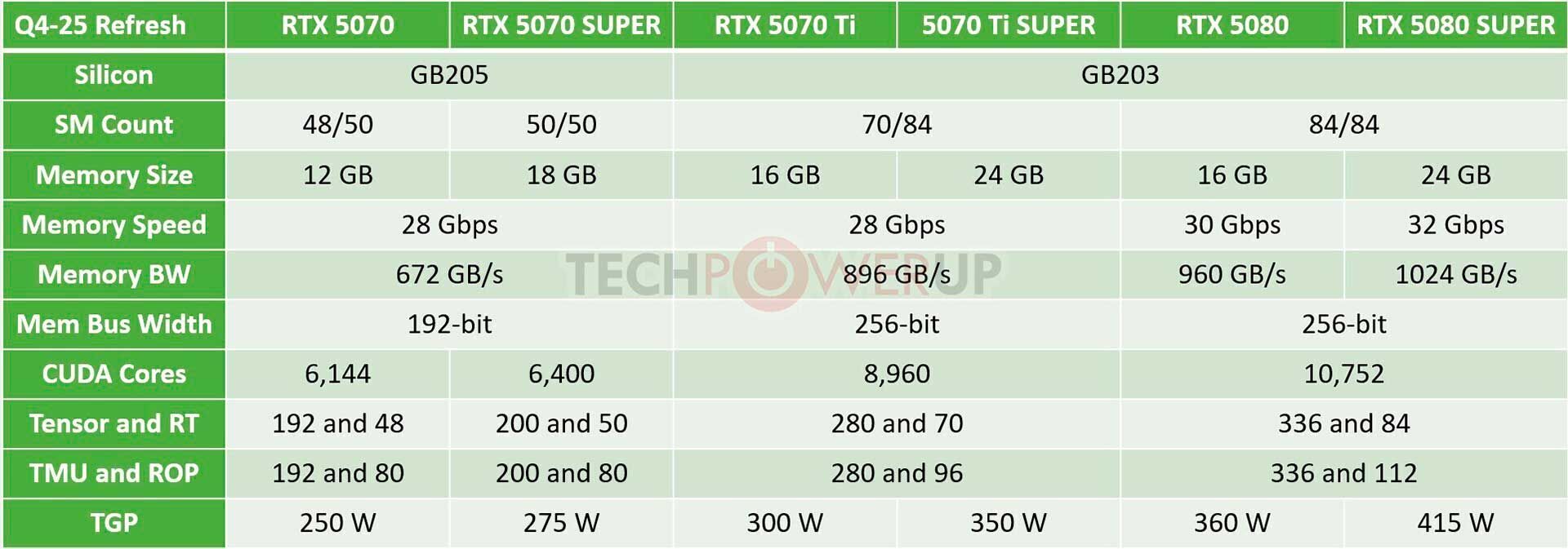 Глобально всё сводится к замене 2-гигабайтных микросхем памяти GDDR7 на 3-гигабайтные. Соответственно, объём видеопамяти увеличится в полтора раза. Также RTX 5070 Super сможет похвастаться небольшой прибавкой вычислительных блоков GPU, а RTX 5080 Super — немного увеличенной частотой работы памяти. Детальнее в таблице: