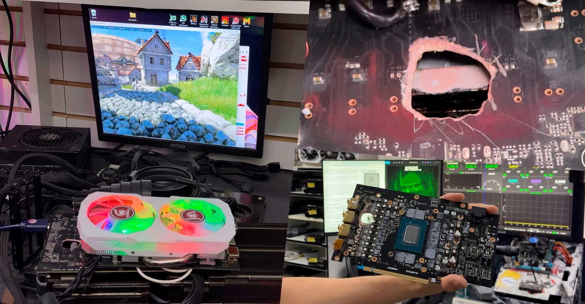 В руки экспериментаторов попала GeForce RTX 5070 Ti с критическим повреждением — буквально сквозной дырой в области узла питания. Такой урон плате — это приговор, чинить уже нечего. Несмотря на настолько сильный прогар, каким-то чудом графический чип и микросхемы памяти выжили. Вместо того, чтобы использовать пострадавшую карту в качестве донора, энтузиасты во имя науки решили её воскресить очень необычным методом.
