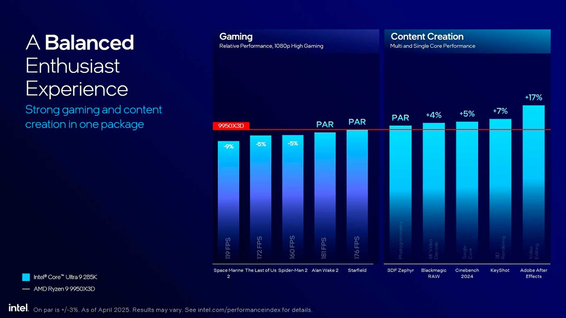 Intel не выставляет свои чипы как «убийцы Ryzen». В основном она говорит о паритете. В некоторых тестах быстрее Ryzen, в некоторых — Core Ultra.