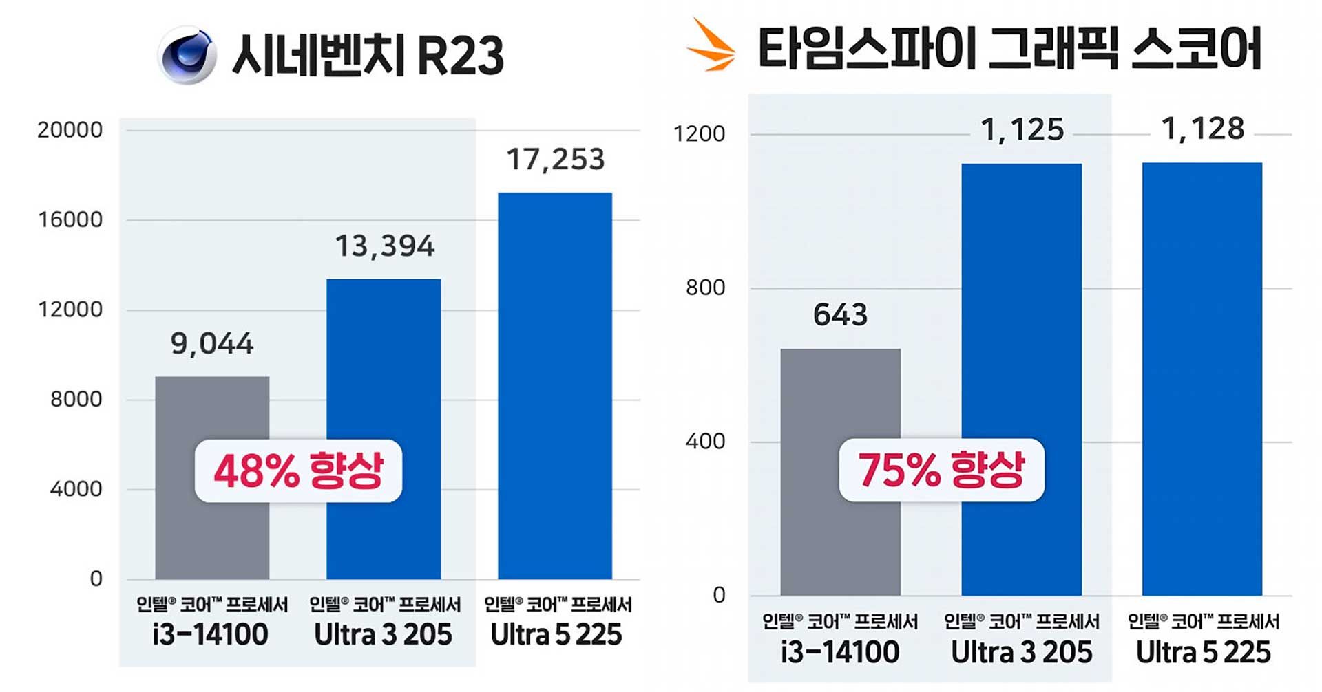 Core Ultra 3 205 и Core i3-14100 столкнули лицом к лицу в Cinebench R23 и 3DMark Time Spy. В первом тесте оценивается быстродействие при нагрузке на все ядра, во втором — только производительность встроенной графики.