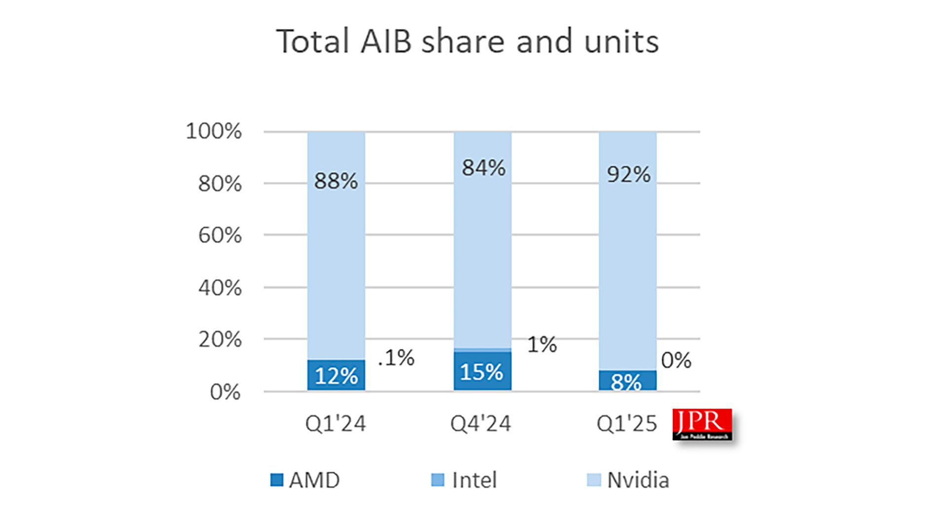 Несмотря на слабый спрос, по количеству отгружаемых графических процессоров NVIDIA всё равно лидирует с огромным отрывом. Согласно последнему отчёту аналитического агентства Jon Peddie Research, в течение января-марта «зелёные» продали 92% от общего количества GPU (за исключением гибридных процессоров со встроенным видеоядром). Доля AMD сократилась до 8%, а вклад Intel составляет менее 1%.