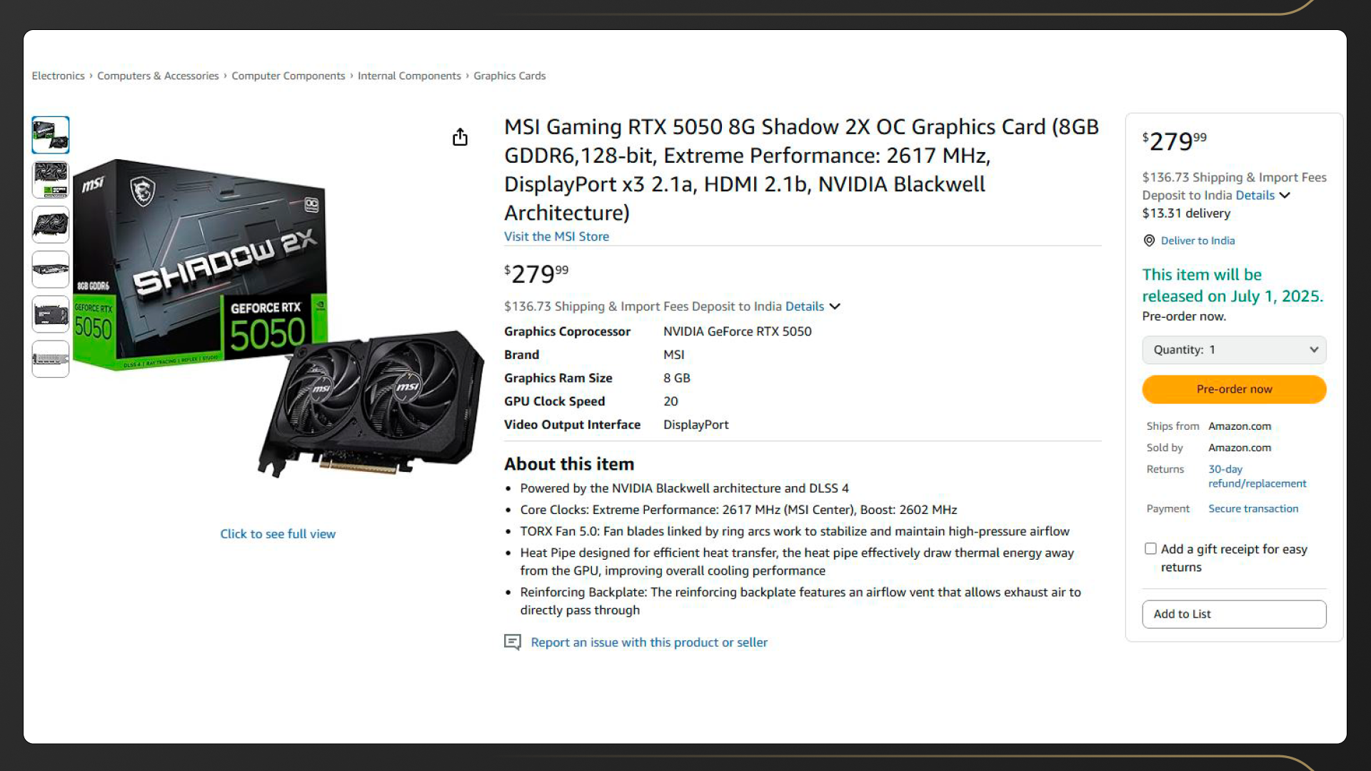 - На Amazon — 280 долларов, что всего на 20 долларов меньше, чем стоит RTX 5060.