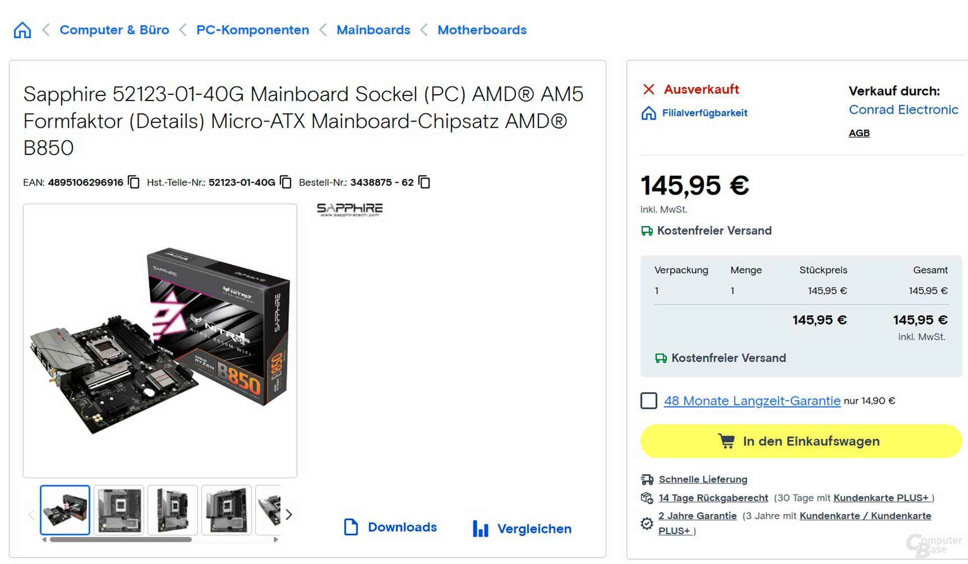 - Nitro+ B850M WiFi — micro-ATX, AM5, 155 евро (~15 000 рублей без налогов и сборов);