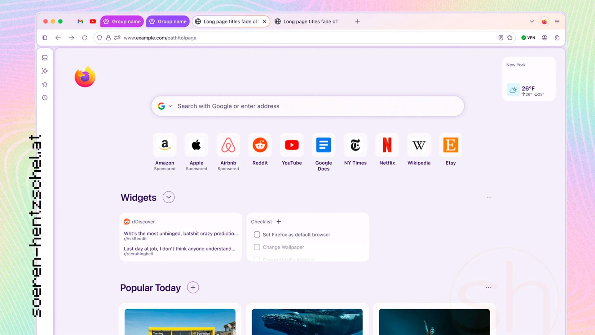 Внутренние концептуальные макеты слил в Сеть разработчик Зёрен Хентшель. Эти изображения раскрывают совершенно новое эстетическое направление Project Nova. Это самое значительное визуальное изменение Firefox со времён обновления Proton пятилетней давности. Дизайнеры Mozilla черпают вдохновение в концепции Material You от Google. Интерфейс браузера научится динамически адаптировать цветовую палитру и тонкие градиенты под обои рабочего стола пользователя.
