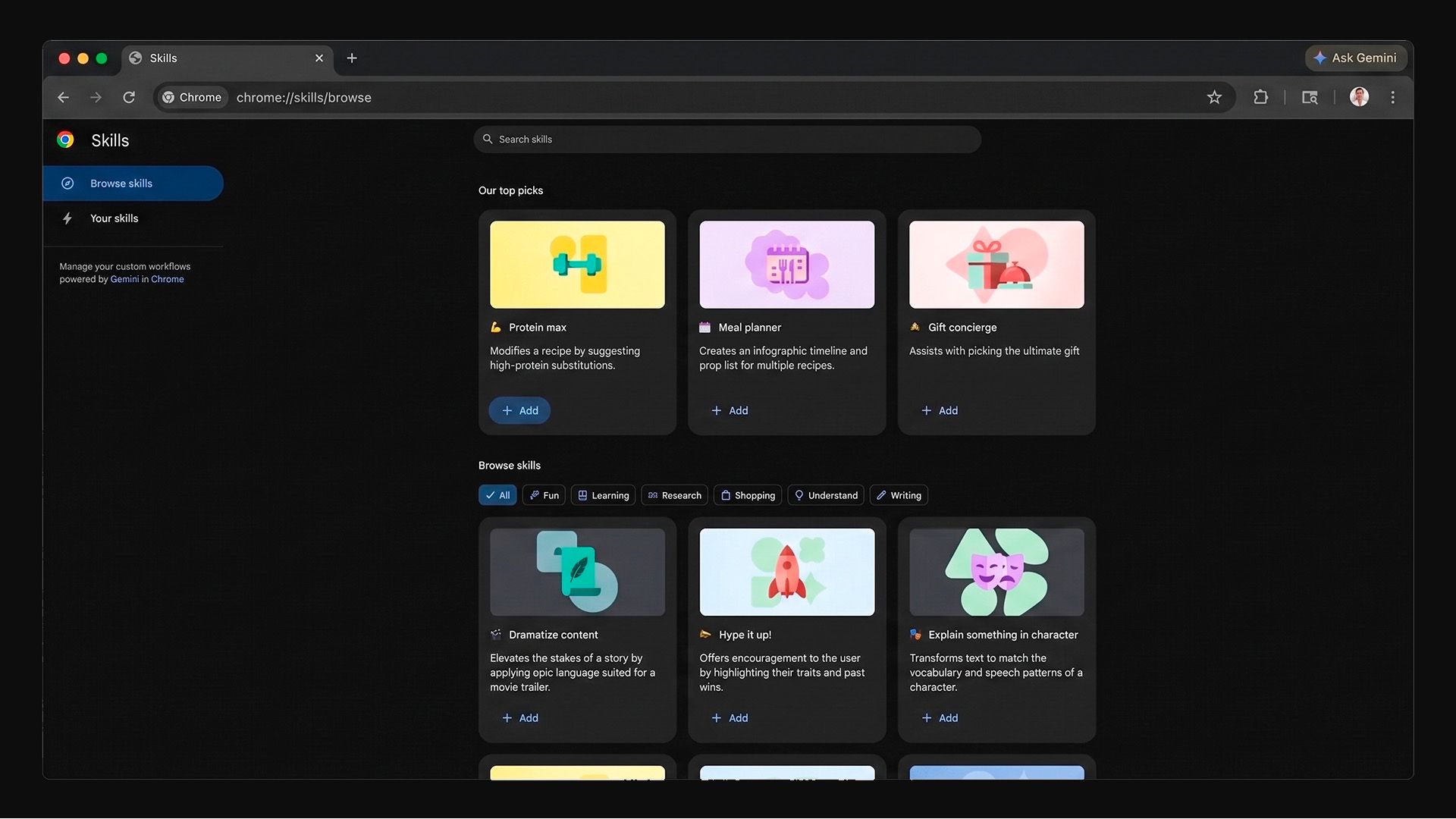 Набирать одни и те же длинные запросы к нейросетям утомляет. Компания Google решила избавить пользователей от ежедневной рутины и внедрила в свой десктопный браузер Chrome новую функцию под названием Skills. Она работает как привычные всем закладки, но сохраняет не ссылки на любимые сайты, а готовые текстовые промпты для искусственного интеллекта.