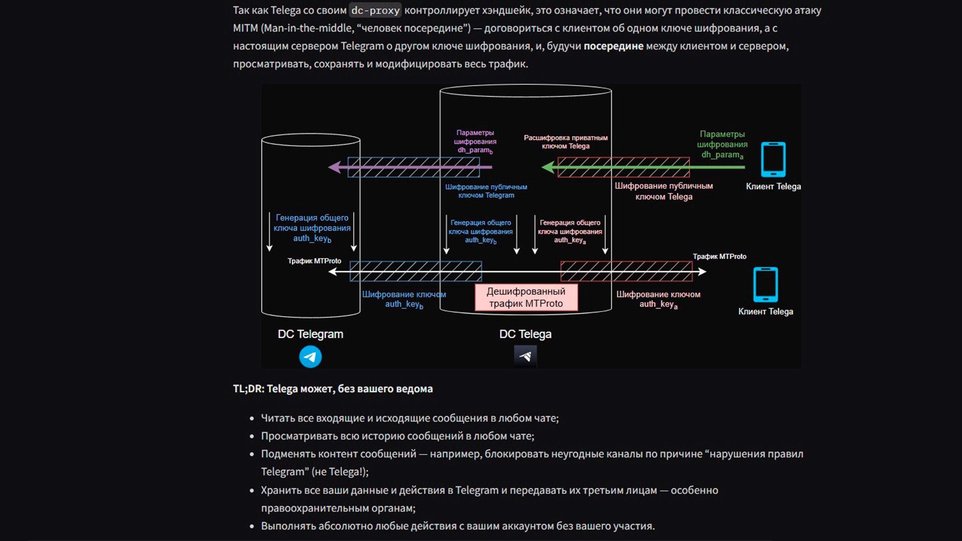 Схема MITM (Man-in-the-Middle) подразумевает, что между тобой и серверами Telegram появляется посредник, который видит все передаваемые данные в открытом виде.