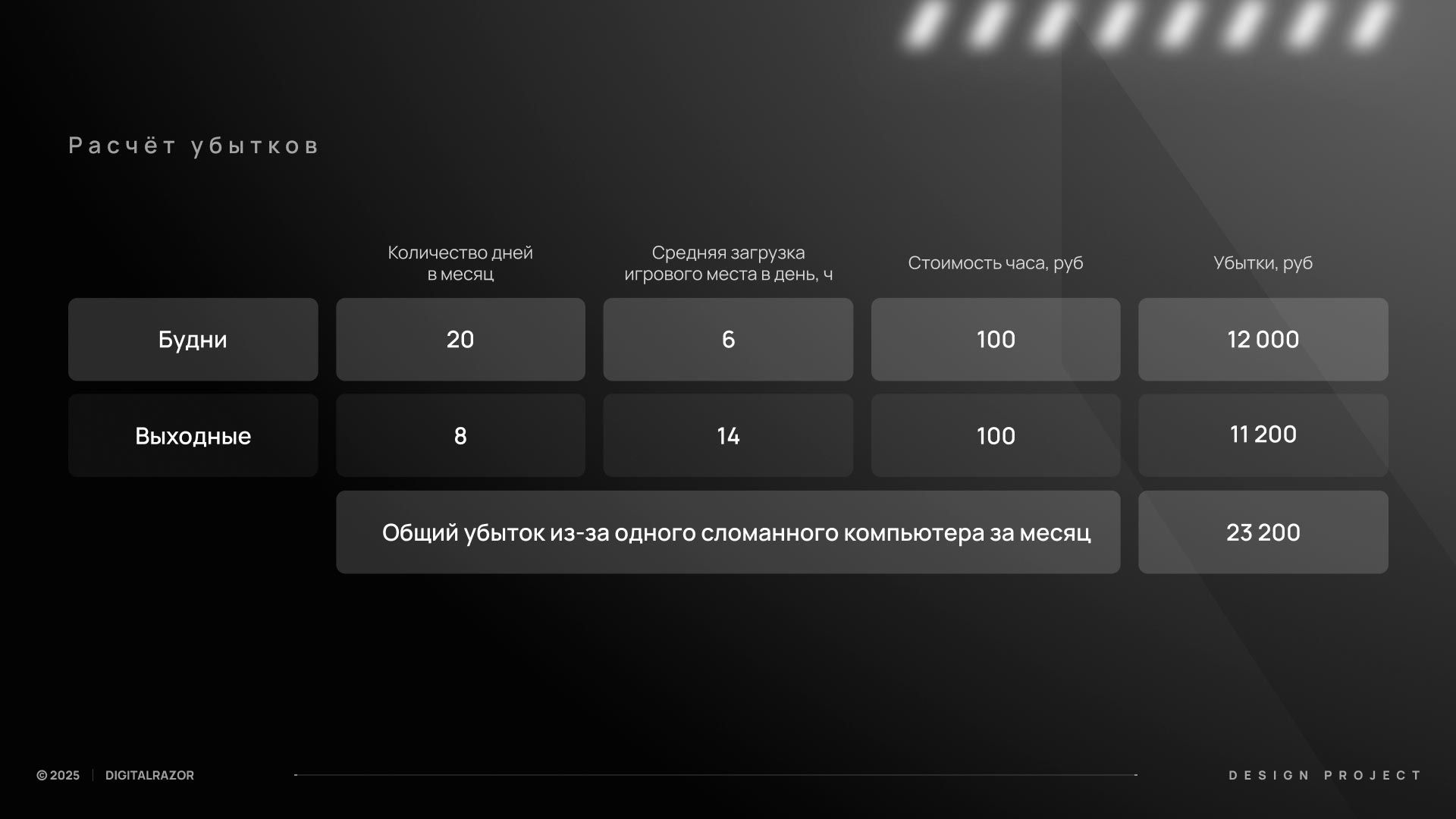 Главный риск для любого компьютерного клуба — простой неисправного оборудования, когда компания теряет часть заработка и портит имидж в глазах посетителей. Если компьютер сломался и простаивает 30 дней (типичный срок решения проблем в розничных магазинах и у небольших поставщиков), это выливается в серьёзные убытки. Математика проста: