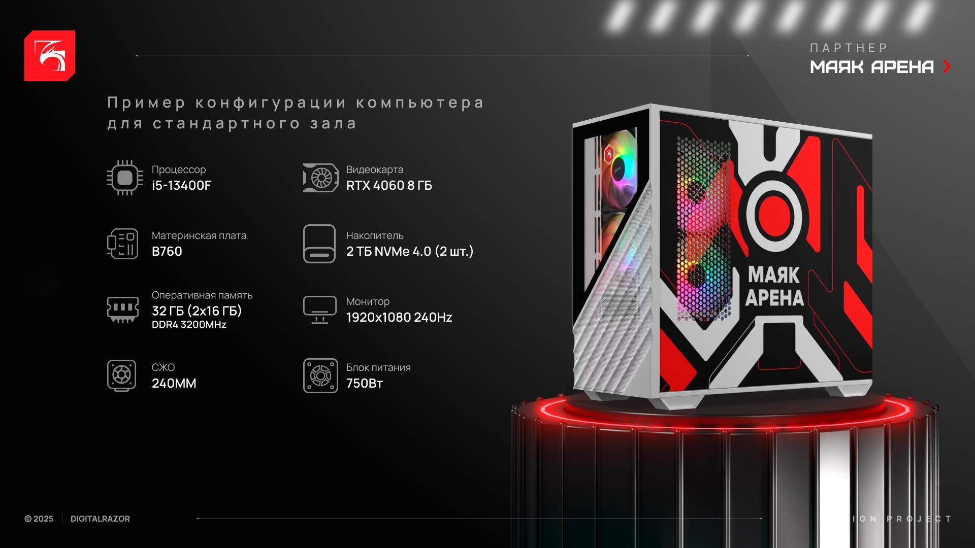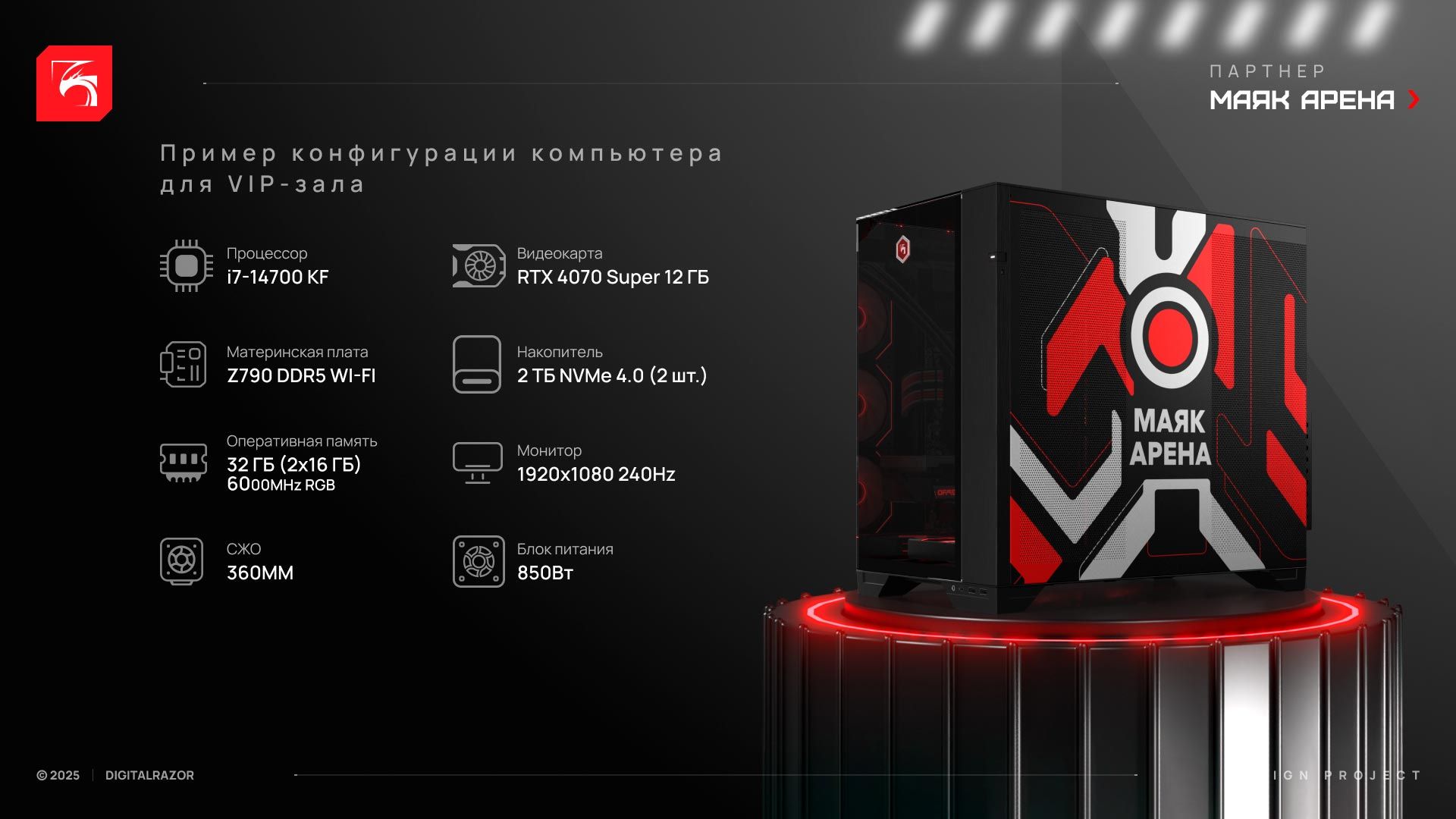 Клиент получил мощное и тщательно проверенное оборудование с индивидуальным художественным оформлением, гарантии и всестороннюю техническую поддержку. Киберспортивный клуб откроет свои двери для первых посетителей в сентябре 2025 года.