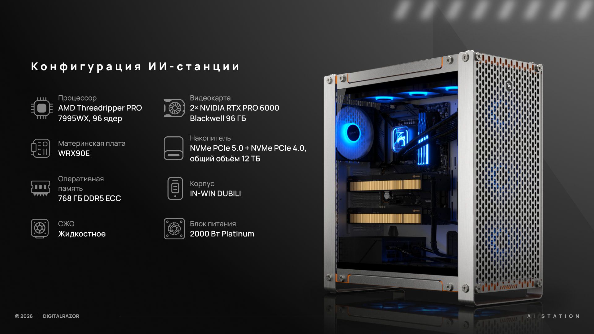 Систему изначально проектировали под локальную работу с ИИ-моделями среднего и большого размера. Собрали рабочую станцию DigitalRazor Performance PRO X3 в следующей конфигурации:
